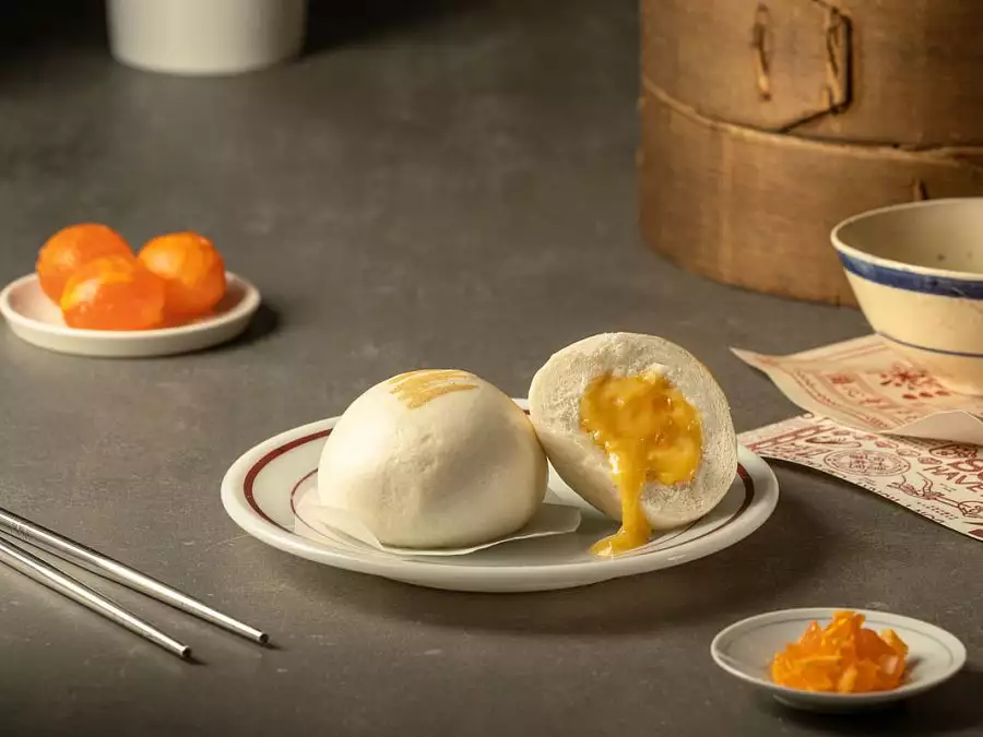 黃金流沙包 鹹蛋杏桃:麵粉加酵母粉自然發酵,口感細緻綿密,搭配鹹甜淡香濃郁的內餡。